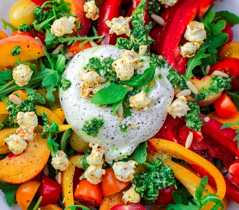A beautiful blend of crushed garlic, pine nuts, basil leaves, and pecorino, with perfectly coated farfalle.